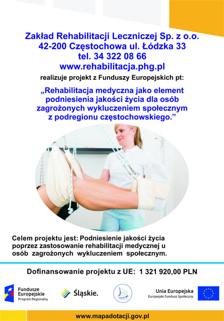 Zakład Rehabilitacji Leczniczej realizował projekt pn. Wprowadzenie na rynek nowych usług medycznych poprzez zakup specjalistycznego sprzętu medycznego przez Zakład Rehabilitacji Leczniczej Spółka z ograniczoną odpowiedzialnością w Częstochowie.